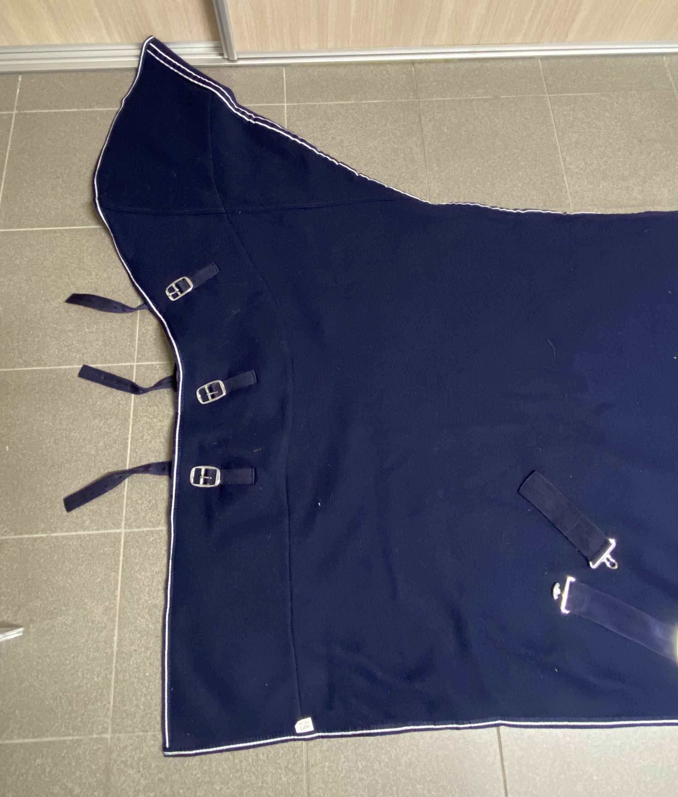 Kleur: donkerblauw met blauw/ witte afboording