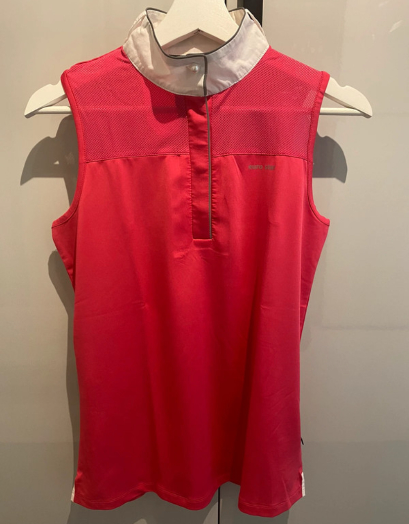 Roze wedstrijdtopje, wit kraagje met parelknopje.