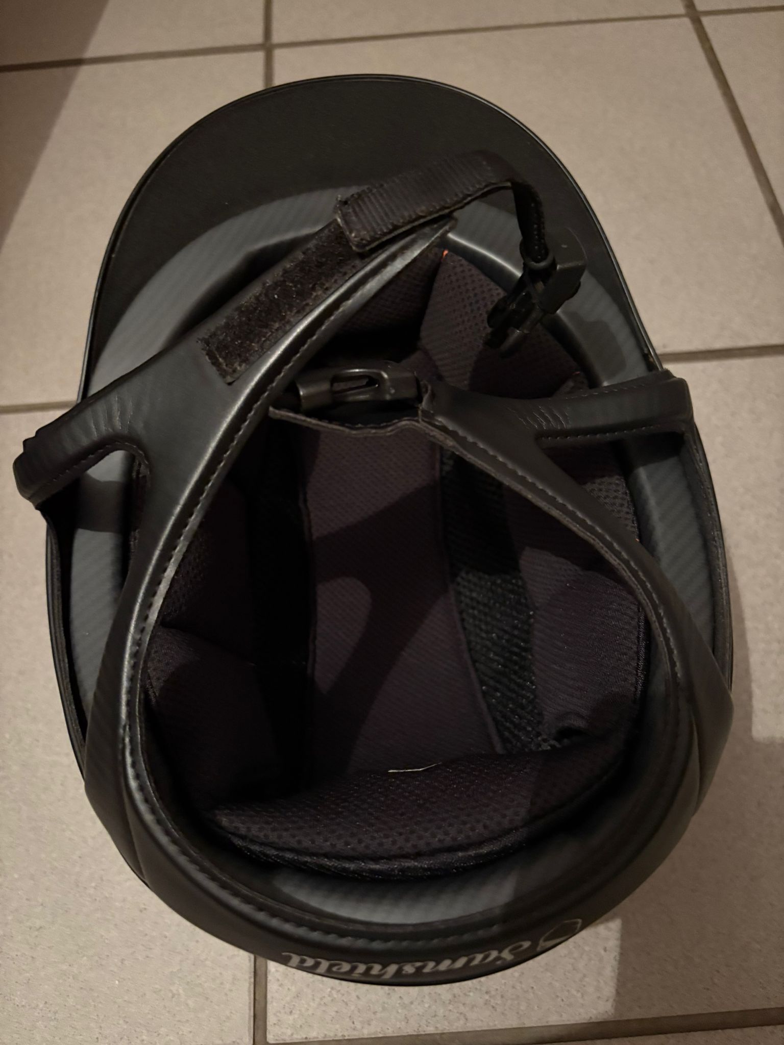 Zwarte tok van Samshield met steentjes rond het logo.