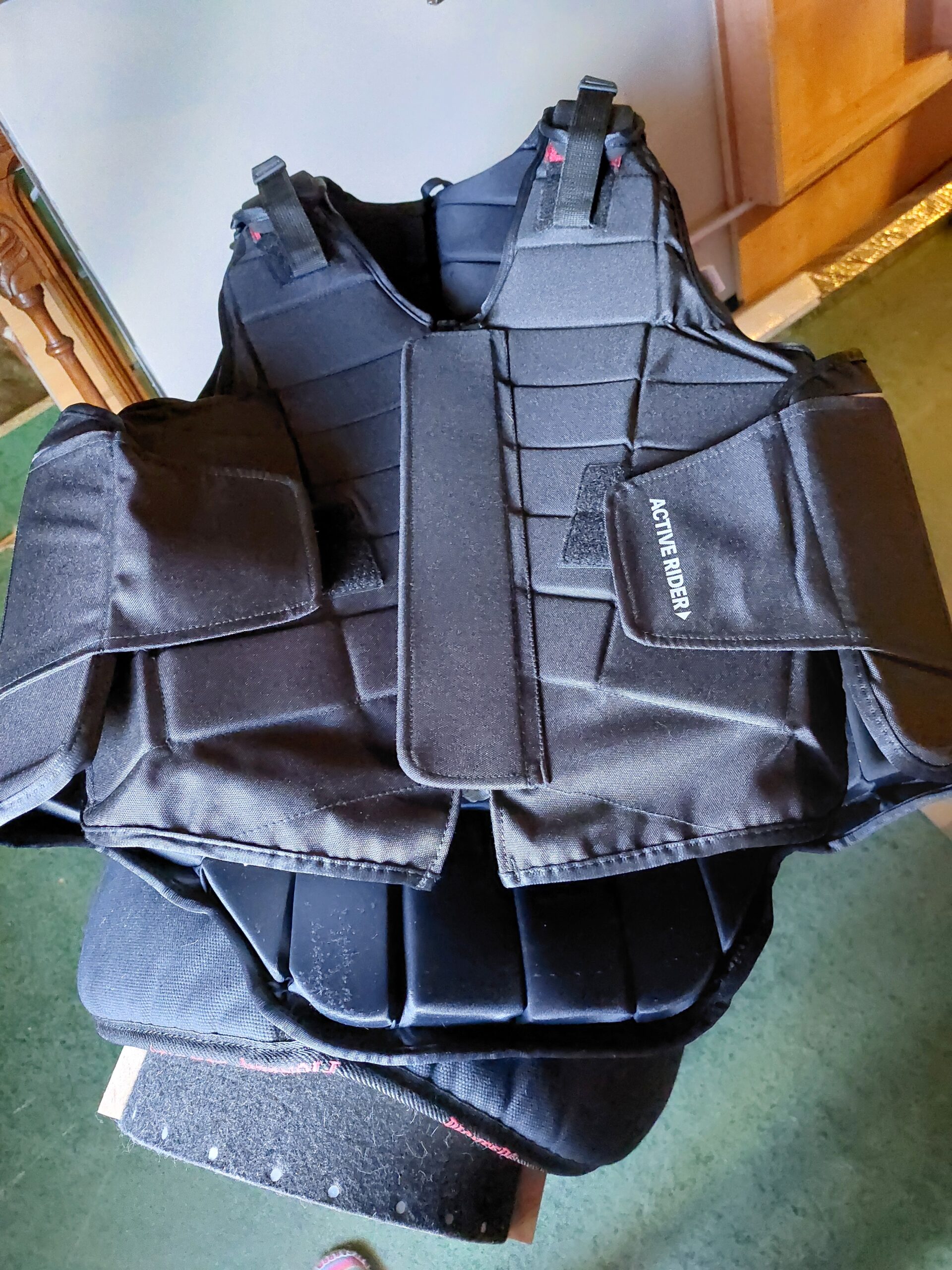 Active Rider L bodyprotector met beweegbare tussenelementen, borst en rugbescherming. Nieuw gekocht en 1x geprobeerd. Paard ziek geworden. Lichtinval vertekend perfect donker zwart.